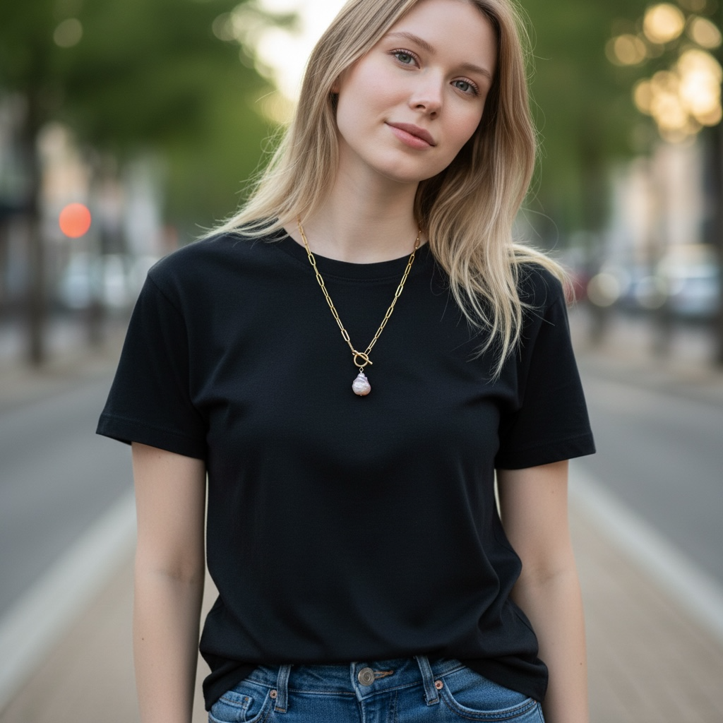 Indulge in the exquisite beauty of this baroque pearl necklace! Effortlessly stand out with its one-of-a-kind design, or effortlessly elevate any look by pairing it with your favorite accessories. Let this stunning piece be a testament to your bold and unique sense of style.